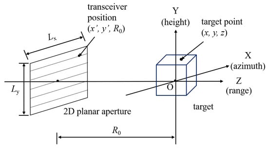 The diagram of the considered MMW close-range imaging system is shown in Figure 1. The motion trajectory of the transceiver is linear. Let be a spatial sampling position of the transceiver, where and , denotes the aperture length in the azimuth dimension (i.e., X dimension), denotes the aperture length in the height dimension (i.e., Y dimension) and indicates the distance between the observation plane and the target origin.