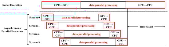 Therefore, in our close-range 3D imaging, the proposed method in this paper utilizes asynchronous parallelism for data processing, which is different from the common serial execution method. Actually, the implementation of the asynchronous parallel scheme is shown in Figure 5, which compares the running time of both the serial execution and the 4-stream asynchronous parallel execution. As Figure 5 shows, 4 streams are created in the GPU, and the data transferred from the CPU is equally distributed to each stream. In such a way, the data transfer and processing among different streams would not interfere with each other. This allows the data interaction between memory and video memory to be executed in parallel with the computation of kernel functions. This approach ensures that the GPU core is busy most of the time while effectively alleviating the drawback of a long time for data transfer between the memory and video memory.