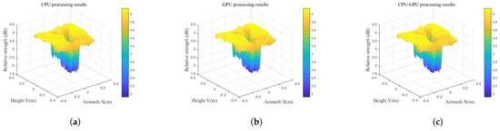 Amplitude-level comparison. (a) is the imaging target energy map obtained by the CPU-only method; (b) is the imaging target energy map obtained by the GPU-only method; and (c) is the imaging target energy map obtained by the proposed method.