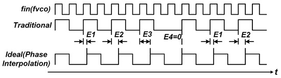 The division ratio of the conventional fractional divider varies, and when the division ratio is set to (2+1/4), its output waveform is shown in Figure 1 (the effect of dithering is not considered here to illustrate the idea). The phase difference between this output waveform and the ideal waveform can be calculated with the quantization error E of the DSM, so the phase of the output signal of the conventional FDIV can be adjusted according to the phase error to obtain the ideal output. Theoretically, the quantization noise introduced by the DSM can be completely eliminated as long as the accuracy of phase interpolation is sufficiently high. However, due to the accuracy and nonidealities of the circuits, there will still be quantization noise, which will be introduced in Section 3. The minimal step of phase adjustment achieved by the phase interpolation circuit is called the phase interpolation accuracy, e.g., , where T is the period of PLL output.