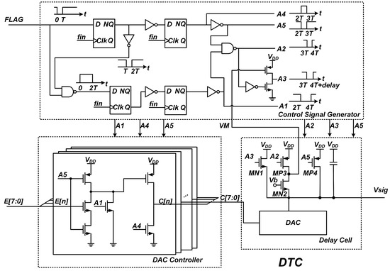 The structure of proposed DTC is shown in Figure 6. The DTC consists of a control signal generator, a DAC controller, and a delay cell. Control signal generator generates a series of control signals when FLAG signal comes and the waveforms of the signals are shown in Figure 6, where T in period of input clock. The DAC controller generates the DAC input according to , which is the phase error provided by the DSM. If is high, will generate a low-level pulse with pulse width of T; otherwise, will generate a low-level pulse with pulse width of 2T. The DAC output transistors will be turned off if the corresponding signal is 0. The delay cell generates a delay with the range from 0 to T and an accuracy of according to .