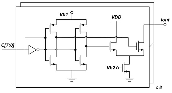 The 8-bits DAC adopted in the DTC block is shown in Figure 9. The cascode structure is used to increase the output resistance and make the DAC output characteristics more ideal. In order to avoid the fluctuation of output current when the output transistors’ DAC is switched on and off, the structure is adopted, in which the current source is always turned on regardless of the value of control signal.