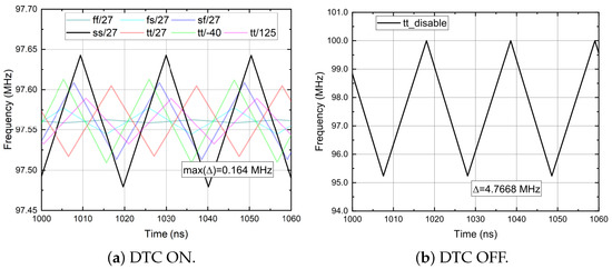 The simulation results of the output frequency of the proposed divider are shown in Figure 10. When the DTC is turned on, the frequency fluctuation at the SS process corner is the largest, 0.164 MHz, and when the DTC is not turned on, the frequency fluctuation at the TT process corner is 4.767 MHz. The DTC effectively reduces the fluctuation of the output frequency of the fractional divider.