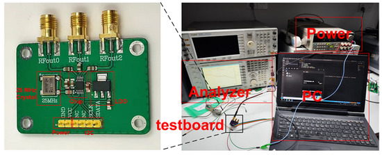 In this paper, the proposed quantization noise reduction technique is implemented using the 0.11 m CMOS process. The photograph of the proposed FNPLL is shown in Figure 12 and the testbench is shown in Figure 13. The chip has a DC supply voltage of 1.8 V and a core area of 1.49 mm, of which the FDIV has an area of 6660 m. The total power consumption of the chip is 20.3 mW, and the power consumption of a single FDIV is 1.356 mW. In addition, the reference frequency is 25 MHz, the FNPLL achieves the phase noise of −117 dBc/Hz @ 1 MHz and dBc/Hz @ 10 MHz, the RMS jitter of 0.860 ps, and a bandwidth of 1.65 MHz.