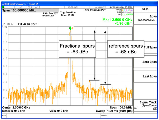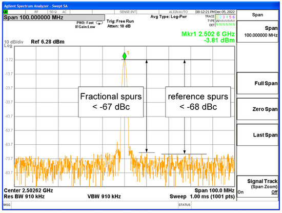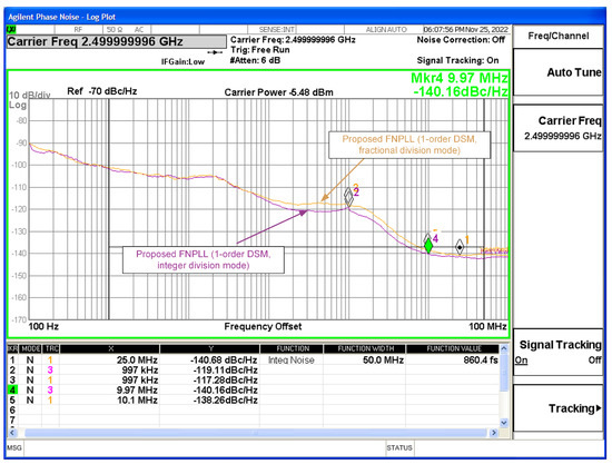 As shown in Figure 14, the phase noise of the proposed FNPLL under the integer division mode (N = 100) and the fractional division mode (N = 100.105) are tested with an on-chip LPF under the same configuration. The center frequency is close to 2.5 GHz. Around the 1 MHz frequency offset, the difference between the phase noise of the proposed FNPLL in the integer division mode and fractional division mode is about 2 dB. The spectrum of the proposed FNPLL with the phase interpolation on and off is shown in Figure 15 and Figure 16. The proposed FNPLL has no significant fractional spurious (<67 dBc) with the phase interpolation on, while the fractional spurious is about −63 dBc with the phase interpolation off.