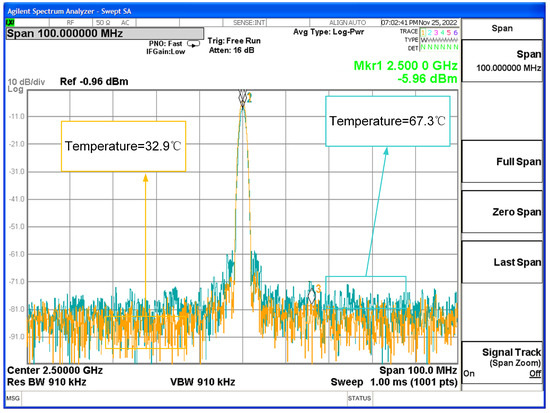In order to find out the effect of the temperature on the proposed PLL, the output spectrum of the PLL is also tested at different temperatures. As shown in Figure 17, the result of C is measured immediately after the chip is powered on, and the other is measured after the chip has been running for 10 min, of which the temperature is C. It can be seen that the white noise in the output spectrum of the proposed PLL increases after the chip temperature increases, but the fractional spurious and reference spurious are still not obvious, indicating that the PLL proposed in this paper can reduce the fractional spurs even at a high operating temperature. This shows that the PLL proposed in this paper can achieve good compensation at higher operating temperatures. However, we could not precisely control the temperature because of the lack of a temperature chamber. More interesting findings might be obtained by testing at more specific temperature points.