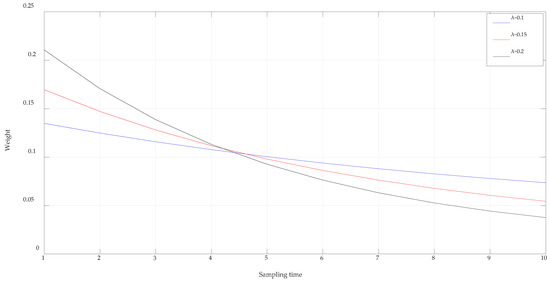 where is the smoothing parameter. N denotes the sliding window size. is the weight of the kth IMU data at the ith time. The sum of all sample weights in a sliding window is equal to 1. Due to the static weight being only related to the sliding window and smoothing parameters, the static weight of each sample is equal, the exponential distribution of dynamic weights can ensure that the weights of samples are different. In addition, Figure 1 shows the change trend of IMU sample data weight in a sliding window. It can be seen from Figure 1 that the weight of the sample at the current time is the largest and the weight value will decay over time, and determines the descending speed of the weight.
