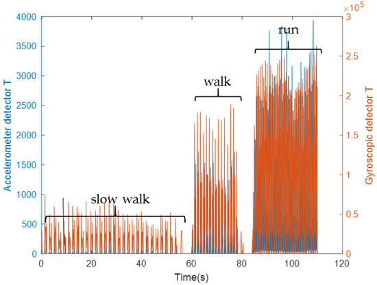 If is equal to 1, it means that the foot is still at the current moment, otherwise, the foot is moving. Since the gait types of pedestrians are diverse, Figure 2 depicts the test statistics of the accelerometers and gyroscopes in the three gait modes. It can be seen from Figure 2 that the statistics of the accelerometers and gyroscopes are different under different gaits, so the threshold value of the proposed zero-velocity detector at different gait velocities is listed in Table 1.