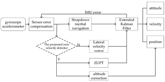 The remainder of this paper consists of the following parts: Section 2 shows the ZUPT-aided INS, and Section 3 studies the improved zero-velocity detection algorithm, and lateral velocity restrict algorithm. Section 4 shows the specific experimental methods and results. The last section concludes this paper.