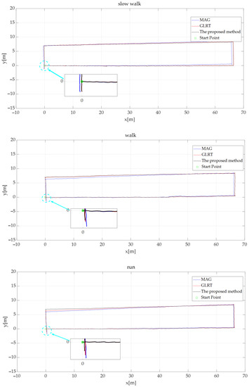 The accuracy of the zero velocity detector has an important impact on position estimation. In the actual test, the closed position error is often chosen as a performance metric. In this section, an experimenter moves along a rectangular path with three gait types (slow walk, walk, run), and finally returns to the original position. The INS closed position error is calculated by using MAG, GLRT, and improved zero velocity detection.