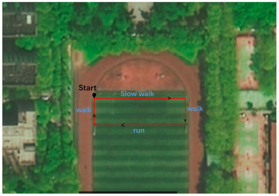A mixed gait experiment is used to evaluate the two-dimensional plane positioning accuracy of the proposed algorithm. As shown in Figure 7, first, the pedestrian walked along a rectangular path of 174.4 m, then ran back to the start point. The reference track can be measured by high-precision real-time kinematic (RTK) equipment produced by U-blox. The tracking trajectory by the proposed method was compared with those by ZUPT-aided INS and the combination scheme of INS calculation and step length estimation models [26].