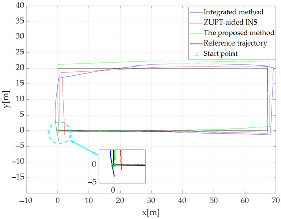 Figure 8 shows the motion trajectory estimated by different methods. As shown in Figure 8, since the designed motion trajectory contains three gaits, the proposed method sets a different threshold for different gaits and uses the improved zero velocity detection algorithm and lateral velocity restrict algorithm, so the motion trajectory calculated using the proposed method is obviously better than the traditional ZUPT-aided INS. Although the step length model and heading angle are used to calculate the pedestrian position, due to the error of step size estimation and heading drift, the position trajectory estimated by the integrated method obviously deviates from the real trajectory.