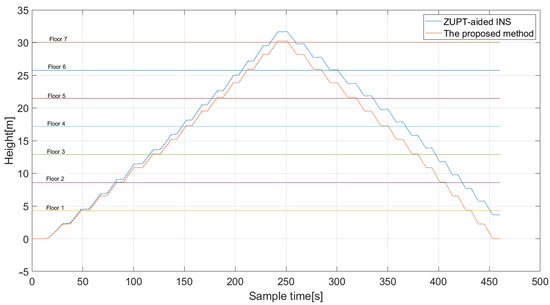 Figure 10 shows the altitude test results by ZUPT-aided INS (blue line), step-aided INS algorithm (red line). As shown in Figure 10, although the altitude positioning of the ZUPT-aided INS can reflect the altitude change of pedestrians, the estimated altitude obviously deviates from the real floor height as time increases. The proposed scheme can use steps well to assist the INS, which effectively reduces error accumulation.