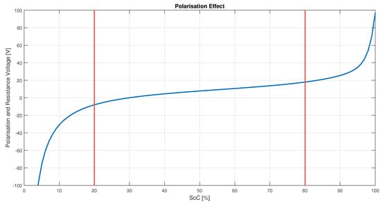 By considering just the polarization effects of the Tremblay model, a test on the voltage increase of a Li-Ion battery pack with 650 V as rated voltage, 660 Ah capacity Q and a charging current of 600 A was carried out. As the polarization effect is proportional to the current Equations (4) and (5), it was selected as the worst case in order to verify the discrepancy between the rated and distorted voltage.