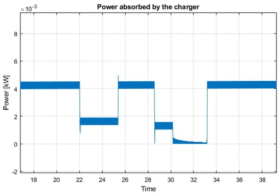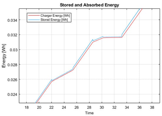 The application of Equation (9) has been verified by simulating the charging process and including the Buck Converter’s switching effect, with different constant currents to confirm the linearity with a model built in SIMULINKTM. By controlling the current with different values, the power, as illustrated in Figure 3, and the energy, as portrayed in Figure 4, at the DC/DC Buck terminals, follows a relatively linear and ‘constant’ pattern that is proportional to the current’s magnitude including the additional implications caused by the Buck’s switching.