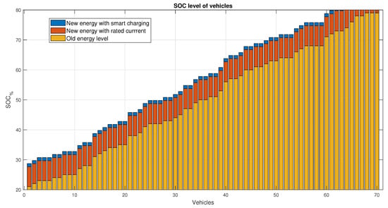 The algorithm will first calculate the energy for each EB in order to obtain Equation (13) for the i time step, and then the objective function Equation (15) will be tested. More specifically, it is checked if the chosen current achieves the correct reduction/increase in CS energy at time step i. If the criterion is not met, the process is repeated by increasing by 0.1A until the condition is fulfilled. The generated by Equation (9) is then assigned to for the next time steps , and the method is continued until the last time step for each element of . Figure 5 illustrates that it is the rise/reduction of energy between each time step that affects the ultimate load form, and not the energy already stored in the vehicles. In Figure 5 case, > with << , therefore the vehicles start at a specific represented in yellow, the orange increment represents the additional charge that should be achieved if the vehicles were charged with rated current . Thus, the blue level represents, in this case, the one that is required in order to achieve the DN requirements by charging the EBs with the smart current (the initial demand lower than the required one).