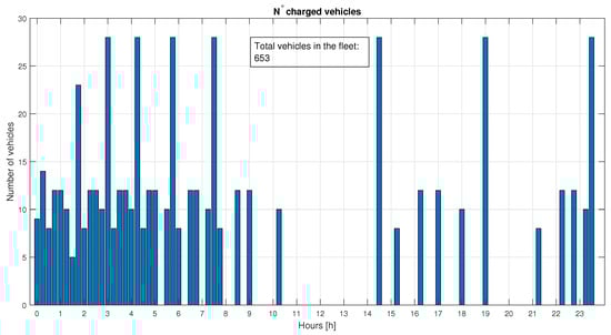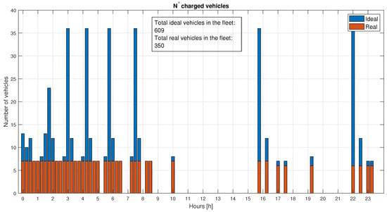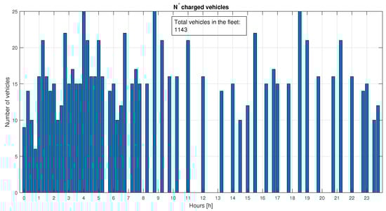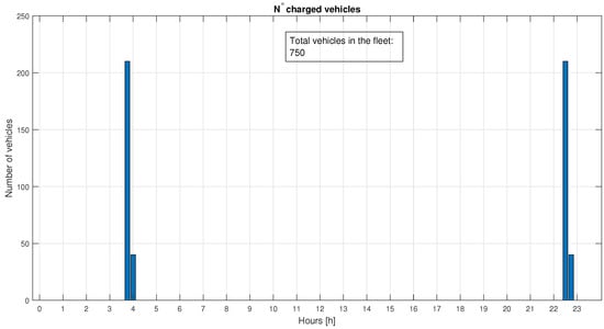 The tracking of vehicles that reach is recorded in a vector Equation (18) that contains the number of EBs that have reached the limit, . The entire fleet is then computed using Equation (19) to achieve perfect load levelling. The vector is used to create the time slots represented by the bars in Figure 6, where the vehicles must be connected in order to have the sufficient power in the CS for the DN’s load-levelling. There is a need to have more EBs available to connect during the time steps where the number of ideal exchanged vehicles is higher. In general, Equation (19) will generate numbers that have no physical or economic meaning (e.g., 70 EBs in the CS with a total fleet of 1000 EBs), hence the value is normalized by inputting the actual size of the available fleet. At this point, the method assigns the real number of EBs uniformly in the slots and generates the Equation (20) vector, which will include EBs as elements, with the remainder set automatically in idle mode () by Equation (14).