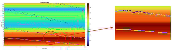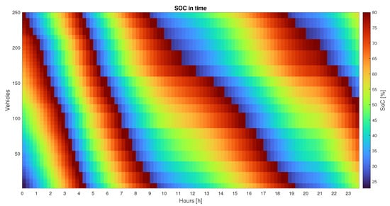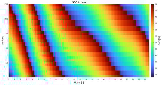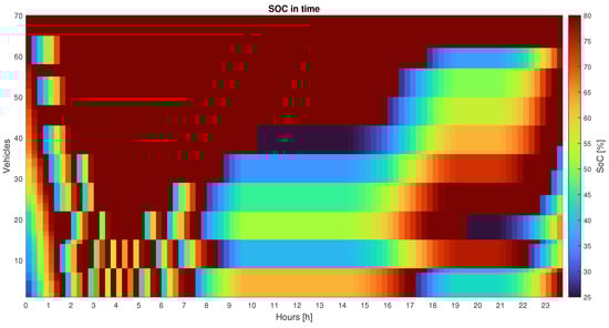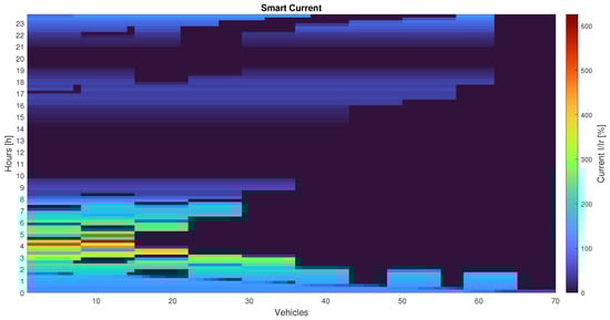 Figure 9 depicts the illustration of Equation (14) when the EBs are nearly fully charged. For example, at the row corresponding to 4am, it is possible to see that the charging current is 140 A for most of the EBs. However, for the vehicles connected to the slots 20 to 50, the current color is different, therefore those vehicles are charged with a lower current (from 20 A to 120 A) because they are close to the full charged state. That is, for the precise vehicle j that will exceed the 80% , the charging current will be tailored as to achieve the exact full charge. The following square has the same color as the others since it represents a newly connected (discharged) EB that charges properly with . Aside from the nearly charged vehicles, all of the others have the same charging current, which is why the color seems uniform during time step i. It is possible to note that the color does not vary monotonously during the day, which is due to the network requirements: when , the indicator turns red (high ) and progressively turns blue (low/zero ).