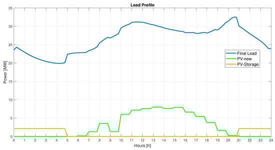 In the last scenario, it is assumed that the PV generation is fully engaged (100% of their rated power, so a sunny day) and that 20% of is stored as self consumption. The relative load behavior before the load-levelling and the PV production is represented in Figure 11 and in Figure 12 are depicted the algorithm’s results relatively to the final regulated demand and the CS. Compared to Section 3.2.1, in Figure 11 it is possible to appreciate the addition of the night self-consumption, and the decrease in the PV power capacity available to reduce the demand. This has some effects on the initial demand. Firstly, the load peak is reduced during the noon period and the night load’s valley depth is increased. With this DN ‘s scenario it is possible to achieve a full load levelling; therefore, both scenarios are suitable for such service. The corresponding currents are pictorially represented in Figure 13.