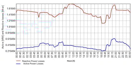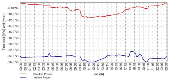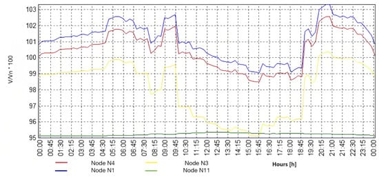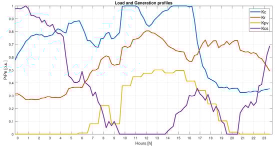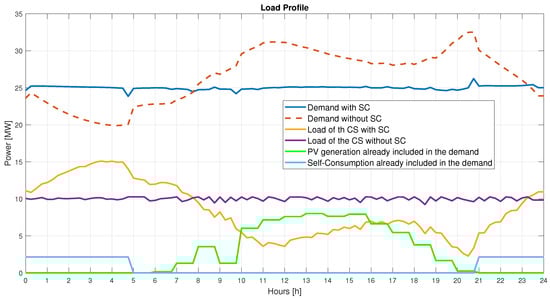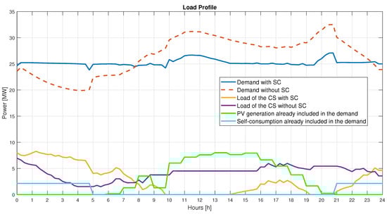 On the other hand, the algorithm could be used to forecast the effects of a given CS and EB on different DN configurations (loads, PV, etc.). It allows for the photovoltaic (PV) power and the penetration of self-consumption (allotment of PV power saved in batteries during the day to be used during the night to reduce power absorbed by the grid ) to be altered. To simulate alternative scenarios, the quota of the PV installed in the DN and the self-consumption as a proportion of its rated installed power can be changed. As the generated PV power saved for local consumption is not part of the usual load, it reduces the PV curve magnitude, thereby mitigating the Duck Shape (a sinking impact of the demand shape during the noon hours caused by increased PV generation, resulting in lower grid energy demand ) []. The load is further decreased during the hours of darkness, when demand is already low. Furthermore, the produced power can be adjusted from 0 to 100% of the rated PV output to simulate varied weather situations.