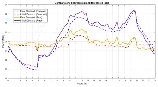 The ultimate mutual effects were computed in power terms and were compared to the starting power demand. Equation (21) computes the power of the CS when the EBs absorb , and Equation (22) computes , the total power absorbed by the CS with . The final load was then calculated using Equation (23) and plotted to ensure the accuracy of the load levelling/peak shaving.