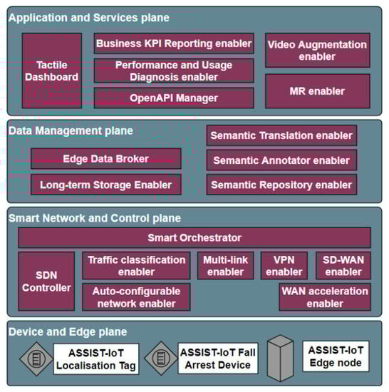 - Device and edge: Contains physical elements (hardware), including user devices, edge nodes, and specialised hardware. For an edge-node to be considered ASSIST-IoT compliant, it must support the virtualisation host, on which the services are run. This plane is access-network agnostic, and specific hardware functions (i.e., hardware implementations/accelerators of AI algorithms) depend on particular use-cases. Here, note that the ASSIST-IoT project delivers specialised hardware for its pilot deployments (e.g., the (geo)localisation tag and the fall arrest device) and a general purpose edge node, as discussed in Section 3.7.