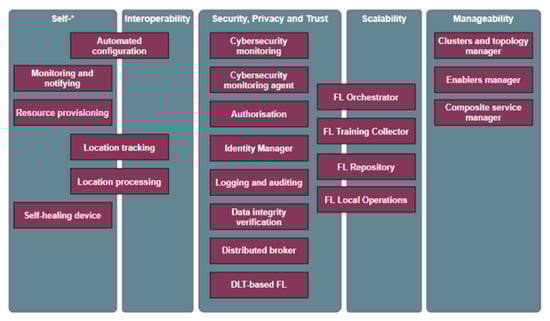 - Manageability: properties related to the control of the lifecycle functions of other planes and verticals, from their instantiation and configuration, to their termination. It also comprises management of devices and coordination of workflows.