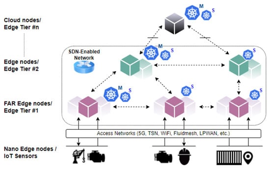 The closest in scope architecture [] was proposed by IoT-NGIN (https://iot-ngin.eu/, accessed on 1 December 2022), where Kubernetes is also leveraged to manage container workloads. A significant aspect of that research was the inclusion of unikernels workload management, connected to cloud-native storage by ceph and rook. However, specific mechanisms were not declared. Furthermore, a focus on federation of devices and communication among them was reported, and offloading was the emphasis of smart orchestration among heterogeneous nodes. Nevertheless, IoT-NGIN considers neither horizontal scalability of resources, nor federated learning.