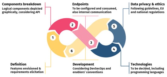 It is an adaptation of the DevSecOps methodology (Figure 8), which extends the DevOps approach, with a focus on the inclusion of security features in each iteration. It contains processes and guidelines that help software and hardware developers to follow the principles of developing services under the RA. Recommendations for managing the complexity of developing a number of technology-independent services that may communicate through various interfaces are also included here. As understanding of the development process requires familiarity with specific software and hardware principles proposed by the RA (see Section 3); the details and guidelines are presented in Section 3.1.