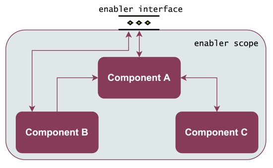 In general, an enabler is the vessel through which modular services, discussed above, are actually delivered. It is a collection of software (and possibly accompanying hardware) components that work together to provide a specific functionality. Internally, an enabler can constitute of any set of components that communicate with each other while being isolated from the outside world. Externally, it is a “black box” that securely exposes selected services. In this sense, the concept is very similar to that of micro-services, with key differences, discussed in this and the following sections. Every enabler must adhere to the following principles: