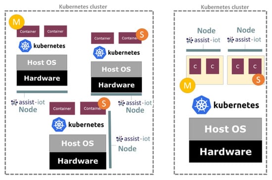 These foundations of design support the quality of the developed system, its manageability, and its production-readiness, among other things. Although the RA is independent of any specific technology and could be implemented using any software that supports its design principles, the ASSIST-IoT project also proposes a reference implementation. Again, the proposal was based on in-depth analysis of the state-of-the-art of implementation of complex IoT systems and analysis of ASSIST-IoT pilots. For instance, in the pilot deployments, it utilises Kubernetes (k8s) and Docker images, and follows standards defined by these technologies. While, obviously, the RA design documents are technology-independent, based on gathered experiences, this contribution provides more details of the concrete implementation on k8s. The choice of k8s was made to ensure quick deployment (and validation of the RA in the real world) and a level of support from the community gathered around this already mature but still expanding technology.
