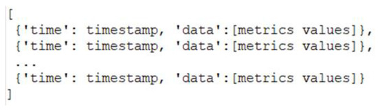 To capture the emotional metrics, it was necessary to implement a script in the Python programming language. This script automatically authenticates itself in API Cortex, checks the connection status and contact quality of the Emotiv Insight, and streams the emotional metrics at a 0.1 Hz resolution. Additionally, the script was responsible for obtaining these data and storing them in a type of structure that could be loaded and processed following data capture. This data structure was an N-dimensional array created using Numpy [41] and stored using the Pickle library. The data consolidated every 10 s presented two key fields: the values of the emotional metrics and the timestamp associated with those values. Figure 2 presents an example of the stored-data structure.