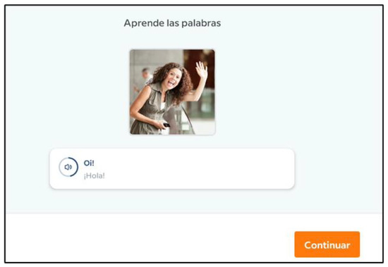 Additionally, with the help of the expert, it was decided to use the first 4 lessons of course number 1, called “the first steps,” from the Babbel platform for Portuguese. During the first three lessons, the new language was introduced with explanations and initial activities, and, in the fourth lesson, there were review activities for the new concepts acquired in the previous lessons.