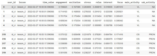 After applying the interpolation, a DataFrame was obtained, which was basically a data structure consisting of rows and columns. This dataframe was obtained for each participant for each lesson and contained the user identifier; lesson; date, associated with its respective hour, minute, and second; and the values of the engagement, excitement, stress, relaxation, interest, and engagement metrics, presenting the data second by second thanks to the interpolation produced. However, the processed dataset overlooked an important factor in the present study: data annotation. This factor is related to the activity and sub-activity of the participant at each instant of time. The following section explores the annotation process.