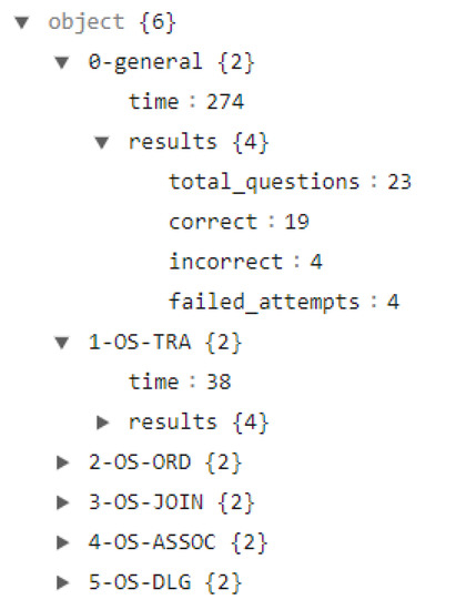 From the review of the recordings, a file with a CSV extension was defined. This file contained the sequence of the activities, that is, the order in which they occurred, and the activity that was made up of the activity and sub-activity, concatenated by means of the “-” symbol, and the total number of questions asked, correctly answered questions, incorrectly answered questions, and failed attempts. Once this was performed, with the help of a script coded in Python, a JSON file was generated from the CSV file. The JSON file consolidated the results of the questions for each activity–sub-activity and the total number of seconds that the participant used during each event or activity. In this way, for each participant, the results obtained during their interaction and time were summarized. Figure 7 presents an example of the file with the generated JSON extension.