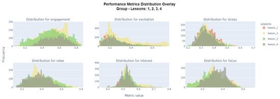 Figure 8 presents the data distributions for each emotion, making a differentiation between the lessons, and, thus, superimposing the histograms. The distribution behaviors for the different emotions were similar, except for excitation, since it could be shown that Lesson 2 caused some participants to experience higher, but perhaps not very constant, values; however, it managed to generate some types of physiological variations in some of them.