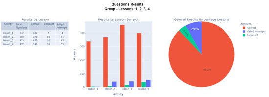 Regarding the results we obtained (Figure 9), the group in general presented a good performance, with an 88.2% success rate in answering the questions asked. In general, it had a percentage of 3.89% for incorrect answers and 7.94% for failed attempts. Lesson 1 presented the lowest rate of incorrect answers and failed attempts In lessons 2, 3, and 4, there were 41, 43, and 53 erroneous attempts, respectively; that is, the students answered the questions incorrectly, and the system allowed them to keep trying or to skip that question. However, lesson 4 showed the highest number of incorrectly answered questions, with a total of 38, compared to the rest of the lessons. In this matter, this lesson corresponded to a review of previously learned concepts. It might be necessary to focus an analysis on this lesson to identify the types of activities that the group failed most often.