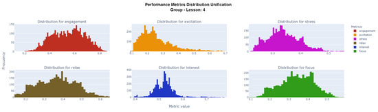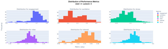 Continuing with the visualization approach, Figure 14 displays, through a histogram graph, the distribution of values experienced by participant 4 during the completion of Lesson 4, separating out each of the six captured metrics.
