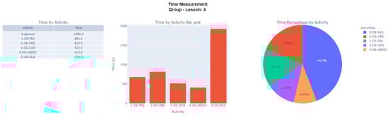 The previous figures were oriented towards the emotional metrics captured. However, the dataset also summarized the overall total time per lesson and the results obtained. For this reason, Figure 15 presents the amount of time at a general level and in each activity–sub-activity by means of a summary table that allows one to clearly observe its numerical values, in addition to a bar graph that presents a visual comparison of the amount of time that each activity–sub-activity took the participant to perform. Finally, a pie chart was constructed to display, as a percentage, the amount of time spent on each activity–sub-activity.