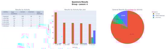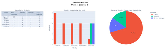 To further develop the picture of the participant’s experience, Figure 16 presents the quantitative results obtained by the participant in the fourth lesson through a summary table. In addition, through the bar graph, a comparison of the numbers of correctly and incorrectly answered questions and failed attempts was performed for each activity–sub-activity. Finally, by means of the pie chart, the general percentage distributions of the correctly and incorrectly answered questions and erroneous attempts studied throughout the lesson were evidenced.