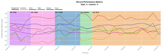 Figure 13 presents the time series of the engagement, excitation, stress, relaxation, interest, and focus metrics for participant 4 in Lesson 4. This was visualized in the form of a line graph, to which was added the distinction of the zones associated with the activity being executed at each instant of time.