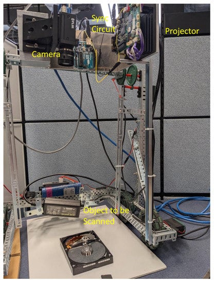 The camera’s position in world coordinates, including its coordinates, and rotations about the three axes, are described by the extrinsic matrix. The intrinsic matrix includes variables like the skew factor, the primary points, and the focal lengths in the main axes of the image plane. Similar criteria are also used to describe the projector. A schematic of this system is shown in Figure 7.