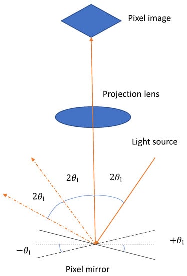 DLP projectors consist of tiny micromirrors that reflect light to generate an image. The projector contains a digital micromirror device (DMD), an optical semiconductor which consists of an array of microscopic mirrors, each of which functions as a light switch. Figure 3 demonstrates the optical switching principle of a micromirror. Electrostatic forces control the cell, and can move the micromirror to an ON () or OFF () position. Each micromirror corresponds to an image pixel, with the grayscale values being controlled by the percentage of ON or OFF times of the mirror per frame of the micromirrors. The image brightness is controlled by the rate of the ON and OFF switching of the mirrors. Figure 4 demonstrates the working principle of a DLP projector. Light enters from a light source and passes through a color filter spinning at high speed, which splits the light into its Red, Green, and Blue components. The DMD chip then projects these Red, Green, and Blue channel images onto a screen. Since the color wheel spins at such a high speed, the human eye can perceive only the resultant image. Grayscale values are produced through time integration [47].