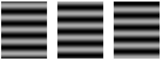 Given that there are only three unknowns , , and that need to be solved, the three-step phase-shifting algorithm (), which uses three steps per phase shift of , uses the fewest steps possible to solve for the phase uniquely, making it suitable for high-speed 3D imaging applications [51]. An example of three phase-shifted fringes is demonstrated in Figure 6. Mathematically speaking, the three phase-shifted fringe images and are as follows: