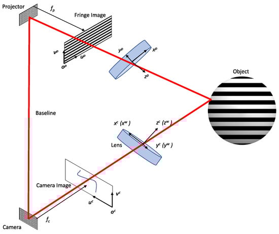 Fringe projection profilometry (FPP) is a variation of the structured light technique that involves projecting phase-shifted fringe patterns using a projector onto an object. These fringes are deformed by the geometry of the object. The fringe images of the object after being illuminated by the fringe patterns are captured by the camera, and 3D reconstruction is performed after phase-based fringe analysis. Figure 1 shows a typical physical setup of a structured light system.