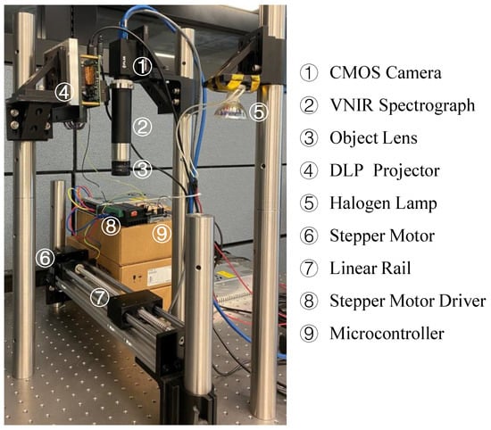 where , , , , and are constant parameters for the proposed system. It is worth mentioning that since here the line-scanning mode was implemented and a parallel setup of the camera-projector was employed in this system, here we did not adopt the triangulation-based 3D reconstruction as introduced in Section 2.5. In the meantime, given that a line spectrograph is used for the camera, the images are acquired in the format of hyperspectral images, which makes the system a 4D (i.e., 3D + spectral data) imaging system.