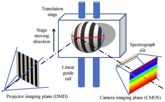Schematic diagram of the 4D line-scan hyperspectral structured light imager combining fringe patterns projection, stage moving, and slit images acquisition (reprinted with permission from [55] © The Optical Society).