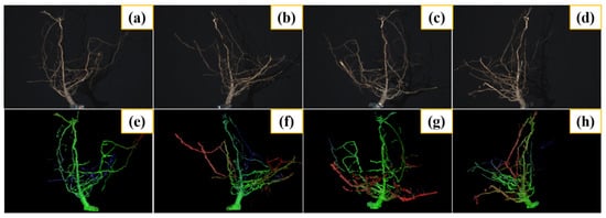 Sample measurement results of soybean roots with complicated morphology using the FPP technology. (a–d) photographs of the measured root samples; (e–h) corresponding 3D measurement results.