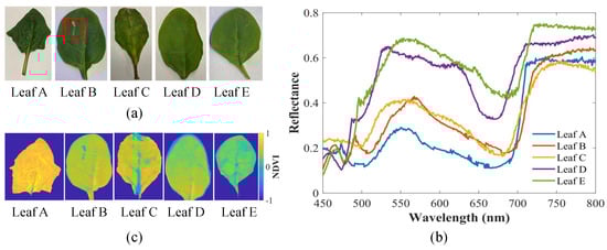 Reflectance and NDVI of spinach leaves at different fresh levels. (a) RGB images; (b) Reflectance; (c) NDVI images. Pictures reprinted with permission from [55] © The Optical Society.