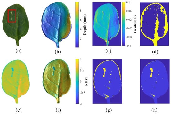 Besides spectral data for evaluating the average or overall leaves quality, spatial data might benefit local defect detection on leaves. In Figure 13a, there is an obvious defect on leaf B. We already obtained 3D reconstructed geometry and the NDVI image of leaf B as shown in Figure 13b,e. Based on 3D geometry, we can extract the profile and vein of leaf B using morphology methods, as illustrated in Figure 13d. From the NDVI image shown in Figure 13e, the NDVI values at the edges, veins, and defects are relatively smaller than their neighbors. Based on the k-nearest neighbors (KNN) algorithm [57], we highlighted the edges, veins, and defects of leaf B, as presented in Figure 13g. Combining the extracted profile and vein from 3D geometry and the highlighted edges, vein, and defects, defects can be marked out, and others are ruled out, as illustrated in Figure 13h.